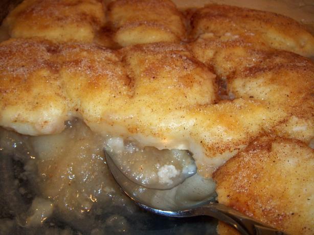 Combine all topping ingredients. Beat with wooden spoon until batter is smooth. Drop batter in 9 portions, over the apples, spacing evenly. Batter will spread during baking. Bake 35 to 40 minutes at 375° or until apples are tender and crust is golden brown. Serve warm with cream or ice cream.